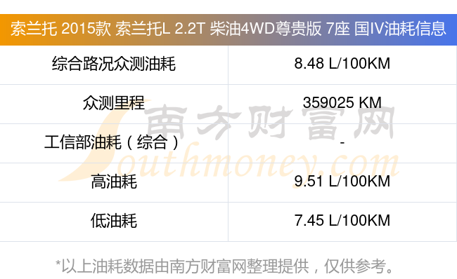 根据多位车主实测得出数据,该车型低油耗为7.45L/100km,高油耗为9.51L/100km,综合路况众测油耗为8.48L/100km,工信部综合油耗为-L/100km。
