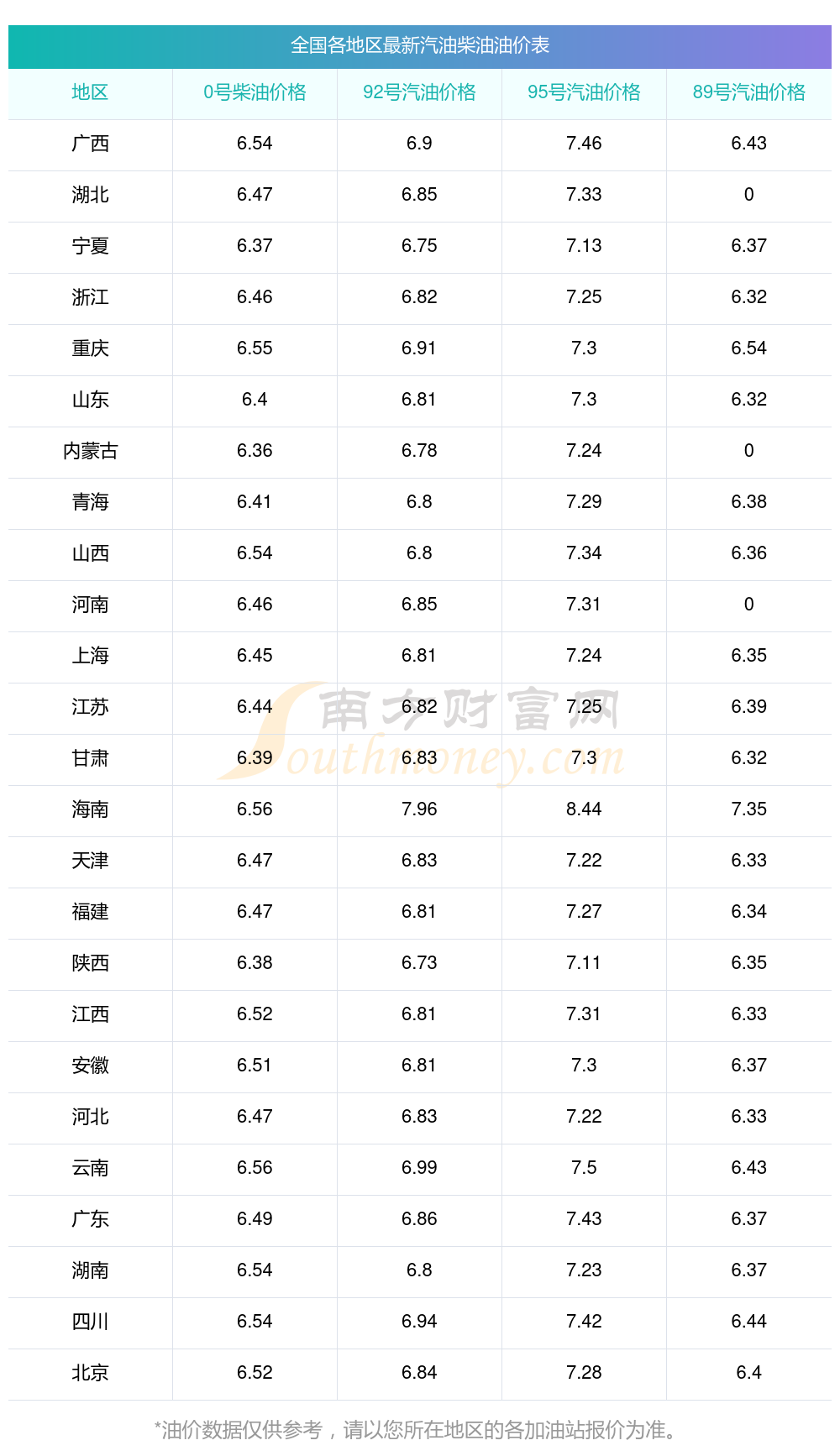 以上数据仅供参考,请以您所在地区的加油站实际售价为准。南方财富网发布此信息的目的在于传播更多信息,对使用该油价信息所导致的结果概不承担责任。
