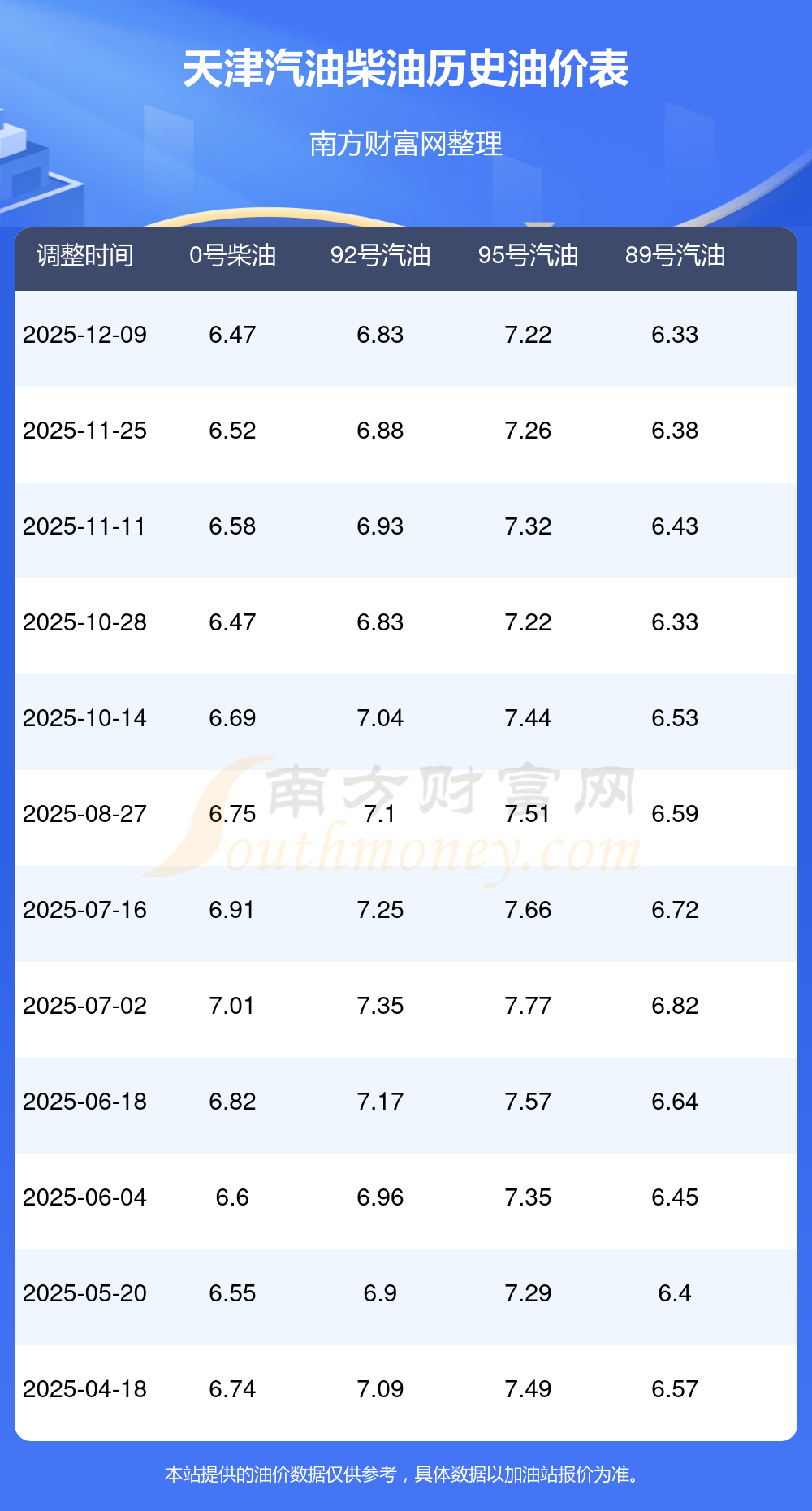 12月14日,天津95号汽油的价格是7.22元每升,本次的调整时间为12月9日,对比上次的调整下降了0.04元,下降0.551%,12月22日24时为下一轮油价调整时间,还有8.36天。