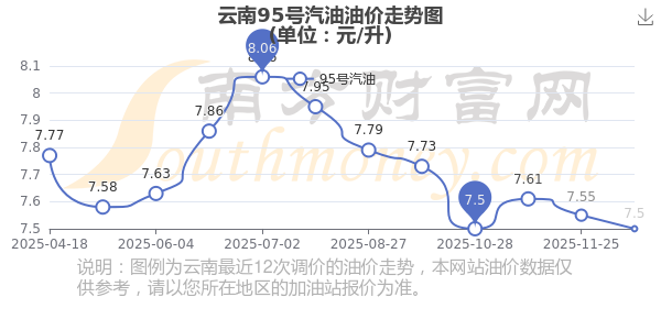 12月15日,云南95号汽油的价格是7.5元每升,本次的调整时间为12月9日,对比上次的调整跌了0.05元,跌0.662%,12月22日24时为下一轮油价调整时间,还有7.65天。