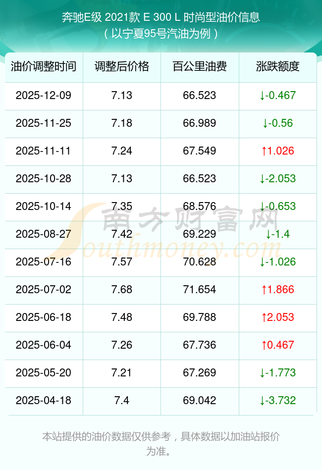 根据12月9日95号汽油最新调整价格7.13元/升来计算(以宁夏为例),该车型每百公里的平均油费是66.523元,上一轮11月25日调整价格7.18元每升来计算,每百公里的平均油费是66.989元,对比上一轮少花0.467元,下一轮的油价调整时间是12月22日24时。