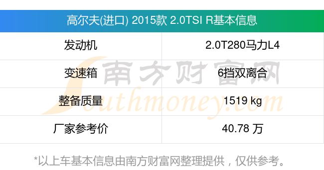 在动力上,高尔夫(进口) 2015款 2.0TSI R配备的是一台2.0T280马力L4涡轮增压发动机,匹配的是6挡双离合自动档变速箱,燃料形式为汽油,常规整备质量1519kg,厂家参考价40.78万元。