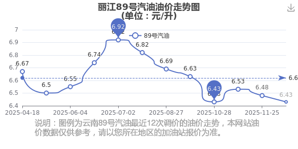 丽江89号汽油12月15日价格查询:12月9日油价调整后,丽江89号汽油6.43元/升,相对上次调整时间11月25日的油价6.48元每升,下降了0.05元,下降0.772%。