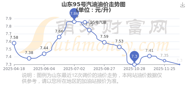 12月15日,山东95号汽油的价格是7.3元每升,本次的调整时间为12月9日,对比上次的调整下调了0.05元,下调0.68%,12月22日24时为下一轮油价调整时间,还有7.63天。