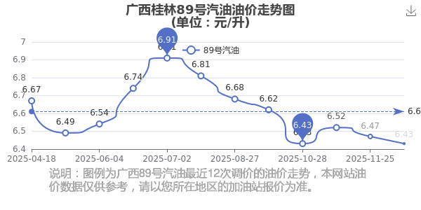油价调整最新消息:12月15日广西桂林汽油、柴油每升的价格为:92号汽油为6.9元,跌了0.05元;95号汽油为7.46元,跌了0.05元;89号汽油为6.43元,跌了0.04元;0号柴油为6.54元,跌了0.04元,本轮油价的调整时间为12月9日。广西桂林下一轮油价调整时间12月22日24时,距离现在还有7.62天。
