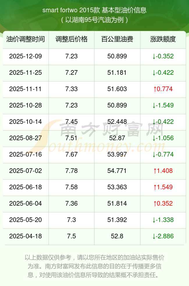 按照12月9日95号汽油最新调整价格7.23元/升来计算(以湖南为例),该车型百公里平均油费为50.899元,按照上一轮11月25日调整价格7.27元/升来计算,百公里平均油费为51.181元,对比上一轮少花0.352元,下一轮油价调整时间为12月22日24时。