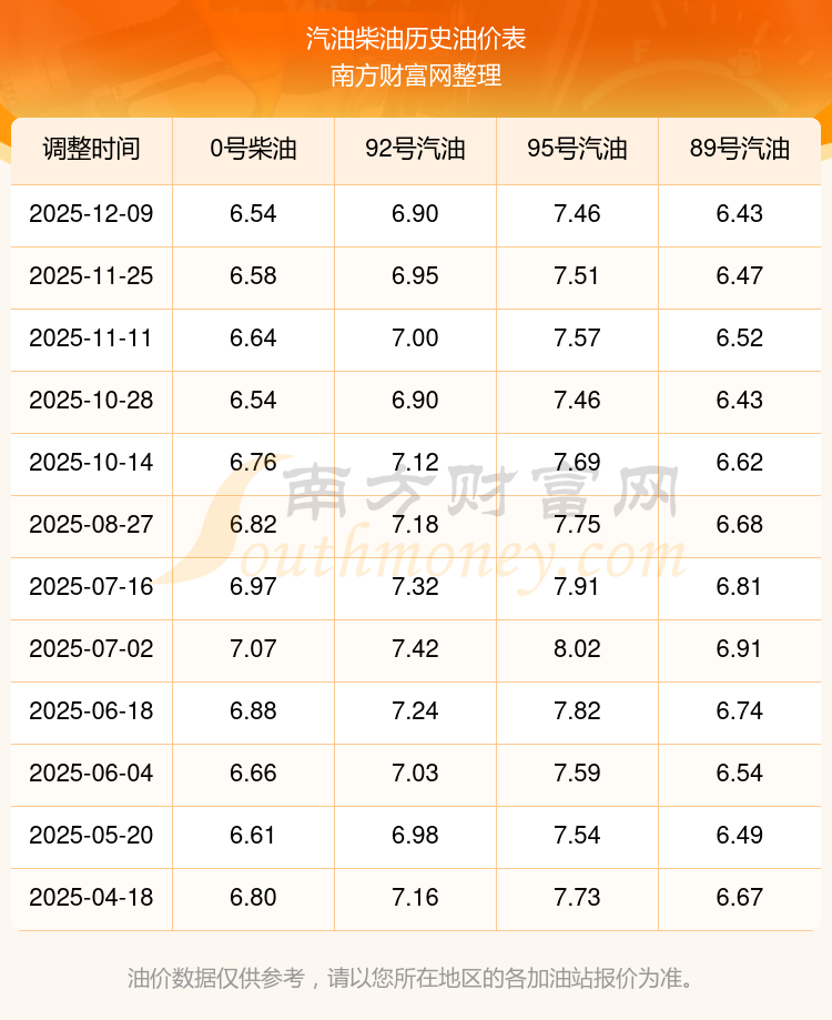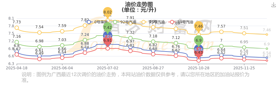 北海95号汽油12月15日的价格为每升7.46元,本次油价的调整时间12月9日,对比上次油价调整时间11月25日的价格7.51元/升,共减了0.05元,减幅达0.666%。下一轮油价调整时间12月22日24时,距离现在还有7.62天。