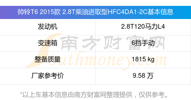 在动力上,帅铃T6 2015款 2.8T柴油进取型HFC4DA1-2C配备的是一台2.8T120马力L4涡轮增压发动机,匹配的是6挡手动挡变速箱,燃料形式为柴油,常规整备质量1815kg,厂家参考价9.58万元。