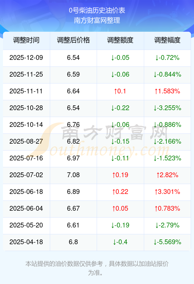 油价调整最新消息:下一轮油价调整时间12月22日24时。12月15日湖南汽油、柴油的最新价格是12月9日调整后的价格,具体为92号汽油6.8元,下调了0.04元,下调幅达0.64%;95号汽油7.23元,下调了0.05元,下调幅达0.64%;89号汽油6.37元,下调了0.04元,下调幅达0.64%;0号柴油6.54元,下调了0.05元,下调幅达0.72%。