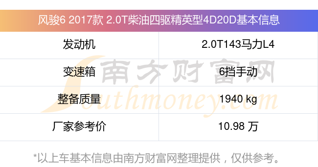 风骏6 2017款 2.0T柴油四驱精英型4D20D动力上配备的是一台2.0T143马力L4涡轮增压发动机,匹配的是6挡手动挡变速箱,燃料形式为柴油,常规整备质量1940kg,厂家参考价10.98万元。