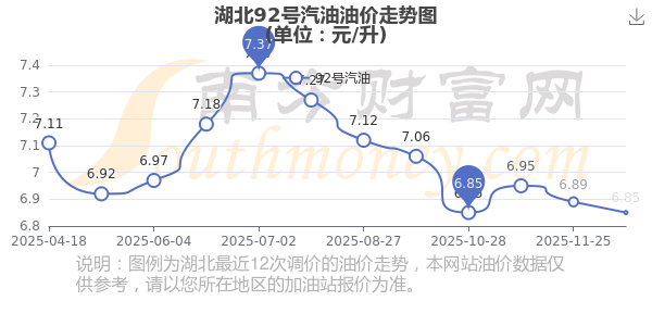 汽油价格调整最新消息:下一轮油价调整时间12月22日24时。湖北汽油、柴油12月15日每升最新价格为12月9日调整后的价格,92号汽油为6.85元,减了0.04元;95号汽油为7.33元,减了0.05元;0号柴油为6.47元,减了0.04元。