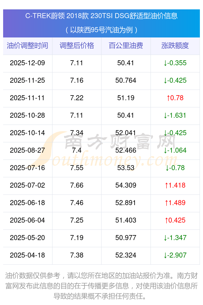 依照12月9日95号汽油最新调整价格7.11元/升来计算(以陕西为例),该车型百公里的平均油费是50.41元,依照上一轮11月25日调整价格7.16元/升来计算,百公里的平均油费是50.764元,对比上一轮少花0.355元,下一轮的油价调整时间12月22日24时。