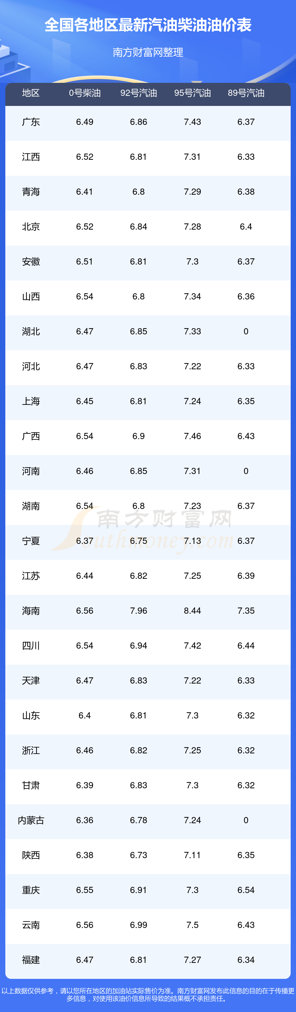 油价数据仅供参考,请以您所在地区的加油站报价为准。南方财富网发布此信息的目的在于传播更多信息,对使用该油价信息所导致的结果概不承担任何责任。
