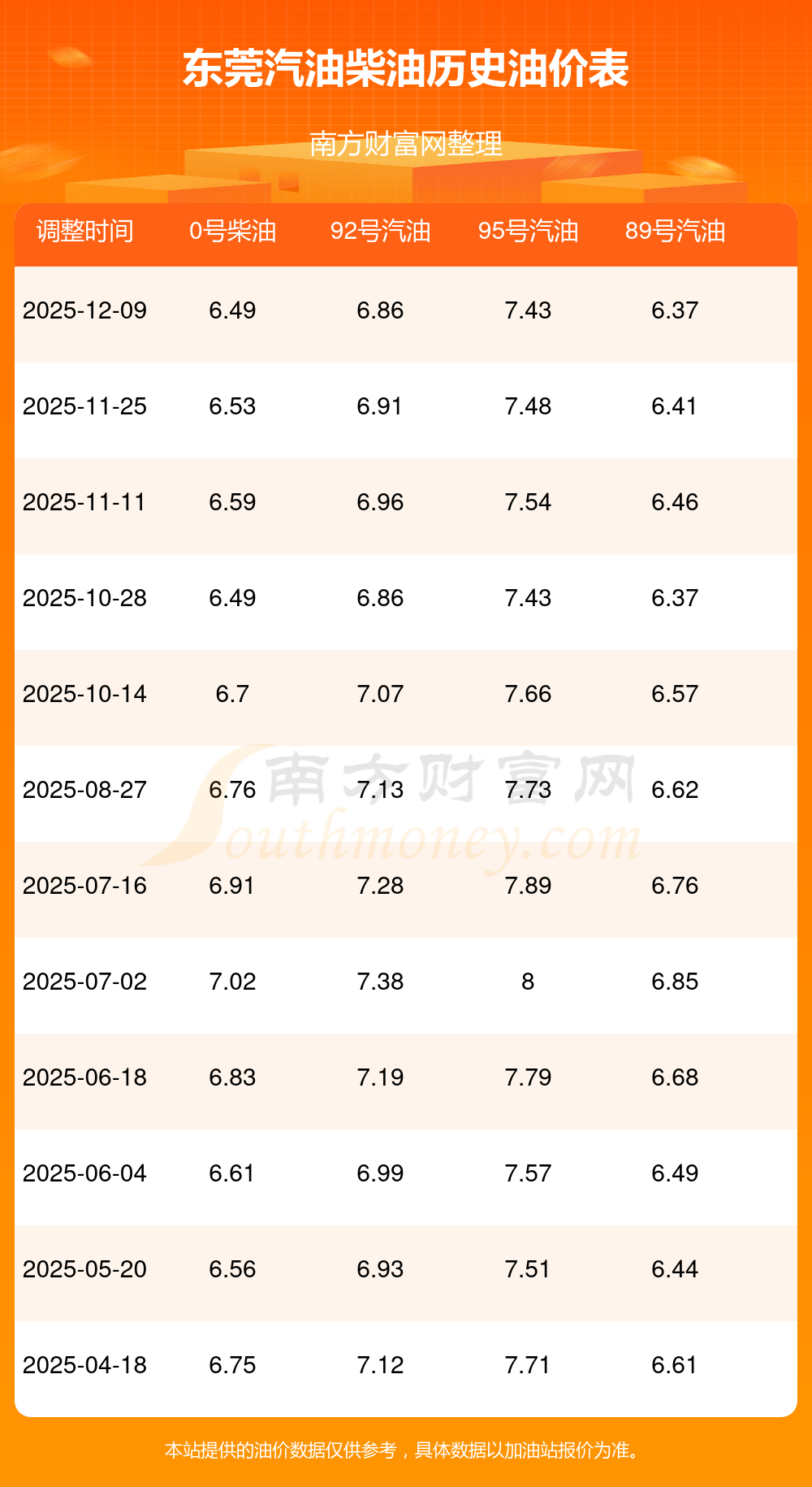 油价调整最新消息:东莞汽油、柴油12月15日每升最新价格为:0号柴油为6.49元,下跌了0.04元;95号汽油为7.43元;92号汽油为6.86元;89号汽油为6.37元,调整时间为12月9日。东莞下一轮油价调整时间12月22日24时,距离现在还有7.6天。
