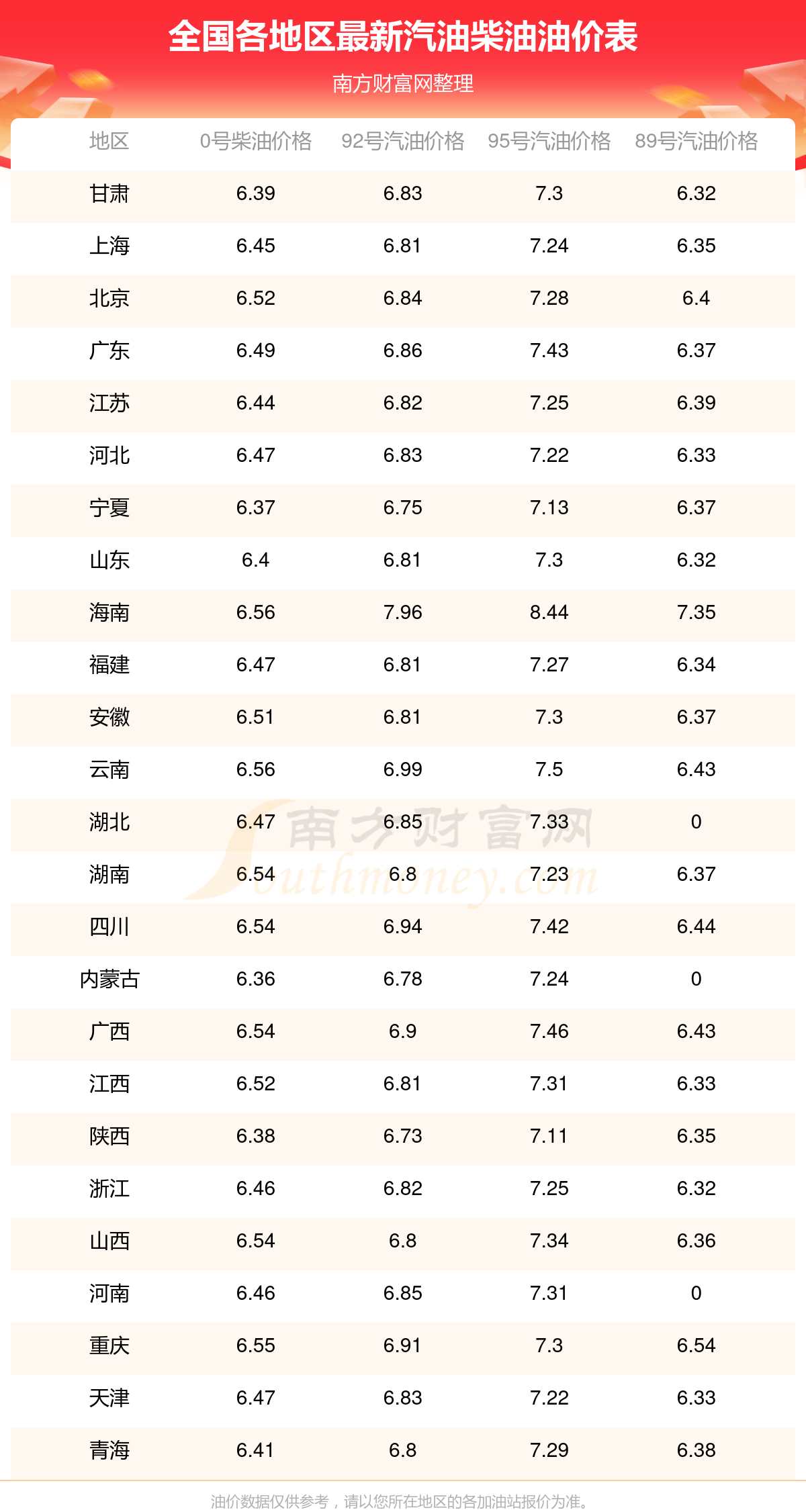 全国各地区2025年最新汽油价格表