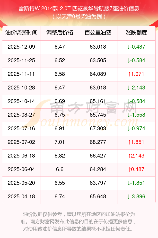 按12月9日0号柴油最新调整价格6.47元每升来计算(以天津为例),该车型百公里平均油费为63.018元,按上一轮11月25日调整价格6.52元每升来计算,百公里平均油费为63.505元,对比上一轮少花0.487元,下一轮油价调整时间为12月22日24时。