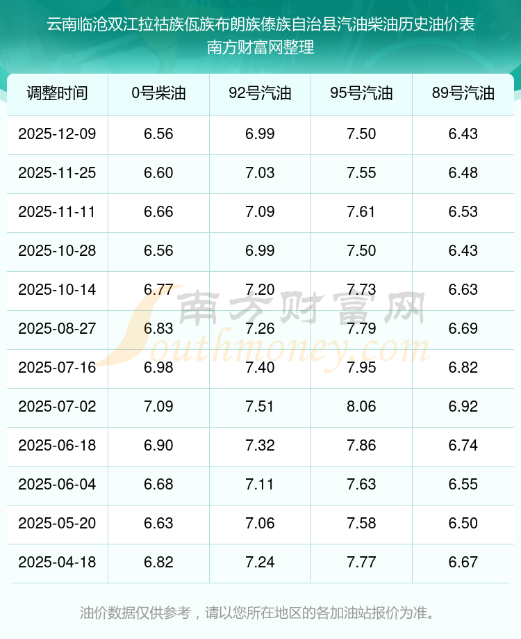 2025年云南临沧双江拉祜族佤族布朗族傣族自治县油价调整时间表