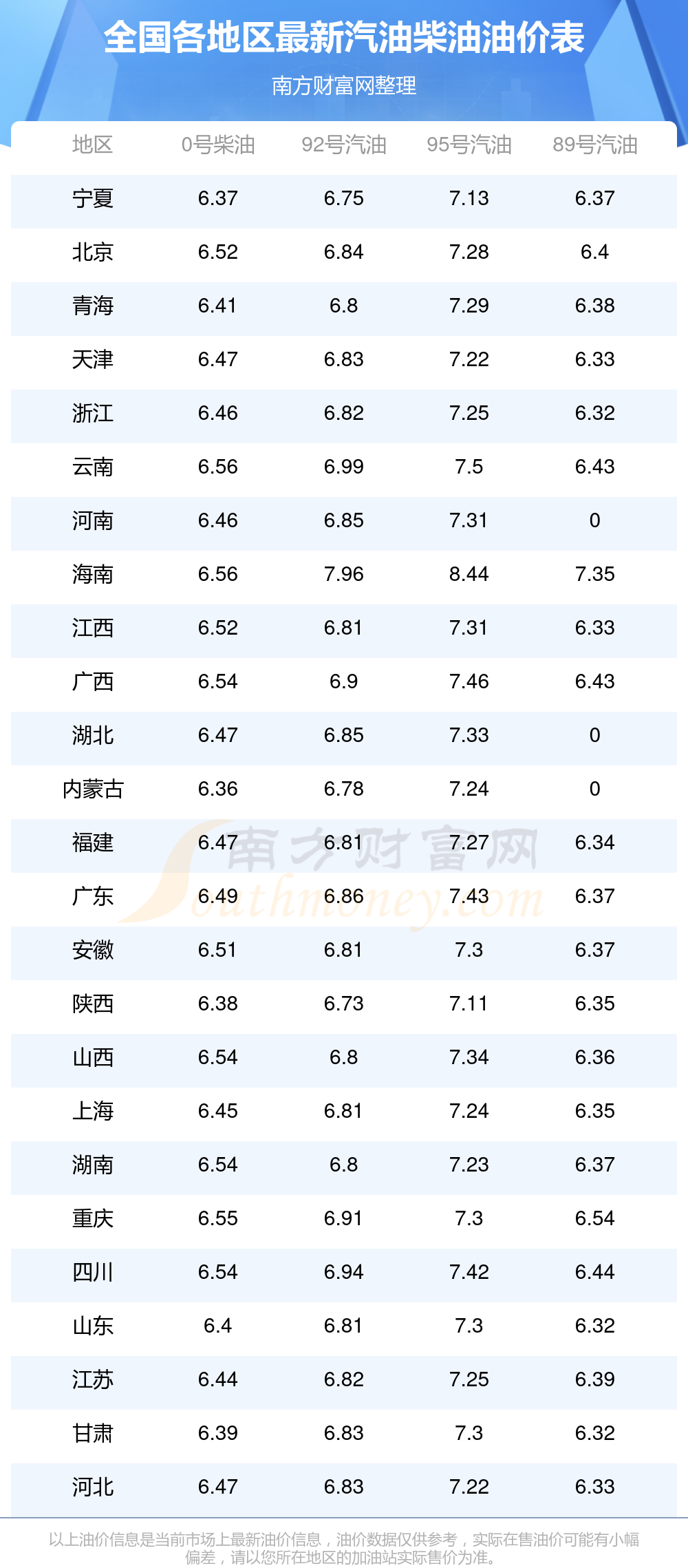 根据12月9日油价调整后的价格,全国0号柴油12月15日最新平均价格为每升6元,其中全国0号柴油最低为内蒙古,价格为6.36元/升,0号柴油最高为海南,价格为6.56元/升。下一轮油价调整时间12月22日24时,距离现在还有7.59天。
