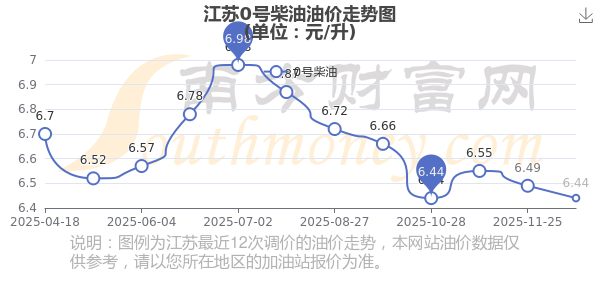 12月15日,江苏0号柴油的价格是6.44元每升,本次的调整时间为12月9日,对比上次的调整下调了0.05元,下调0.77%,下次调整时间为12月22日24时,还有7.58天。