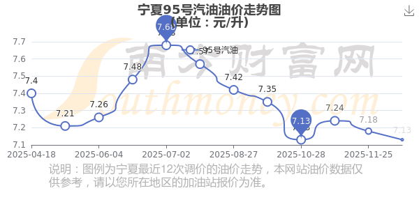 12月15日,宁夏95号汽油的价格是7.13元每升,本次的调整时间为12月9日,对比上次的调整下调了0.05元,下调0.696%,下次调整时间为12月22日24时,还有7.58天。