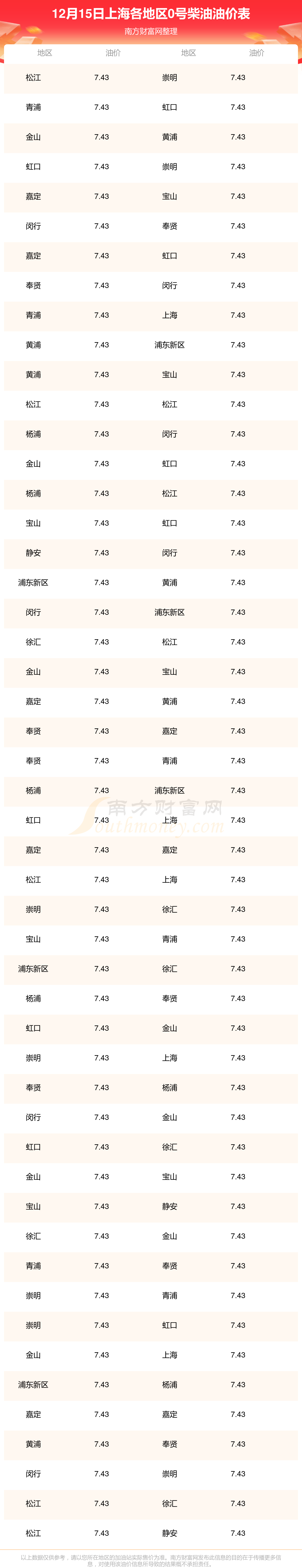 12月15日上海0号柴油最新价格6.45元/升,调整时间为12月9日,相对上次调整降了0.05元。