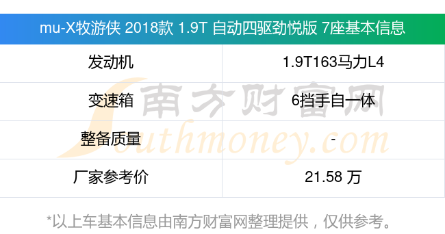 在动力方面,mu-X牧游侠 2018款 1.9T 自动四驱劲悦版 7座搭载的是一台1.9T163马力L4涡轮增压发动机,匹配6挡手自一体自动档变速箱,燃料形式为柴油,厂家参考价21.58万元。
