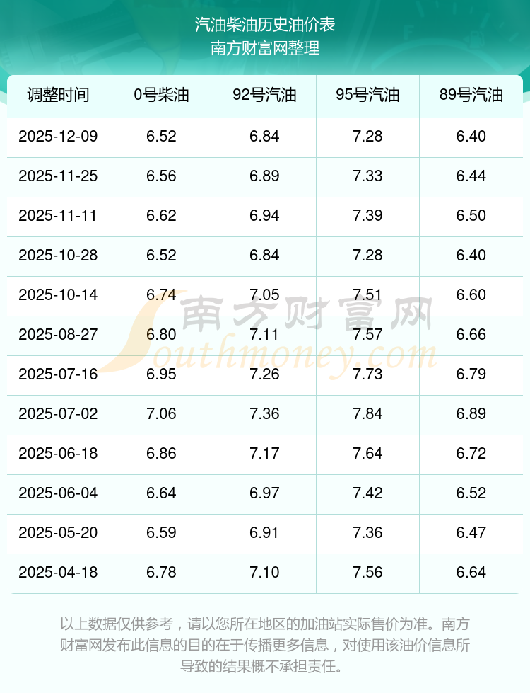 延庆95号汽油12月15日的价格为每升7.28元,本次油价的调整时间12月9日,对比上次油价调整时间11月25日的价格7.33元/升,共跌了0.05元,跌幅达0.682%。下一轮油价调整时间12月22日24时,距离现在还有7.58天。