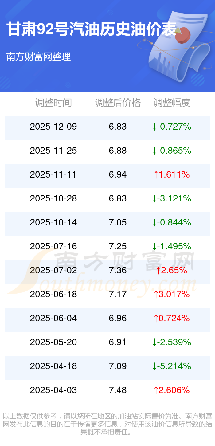 12月15日,甘肃92号汽油的价格是6.83元每升,本次的调整时间为12月9日,对比上次的调整跌了0.05元,跌0.727%,下次调整时间为12月22日24时,还有7.57天。