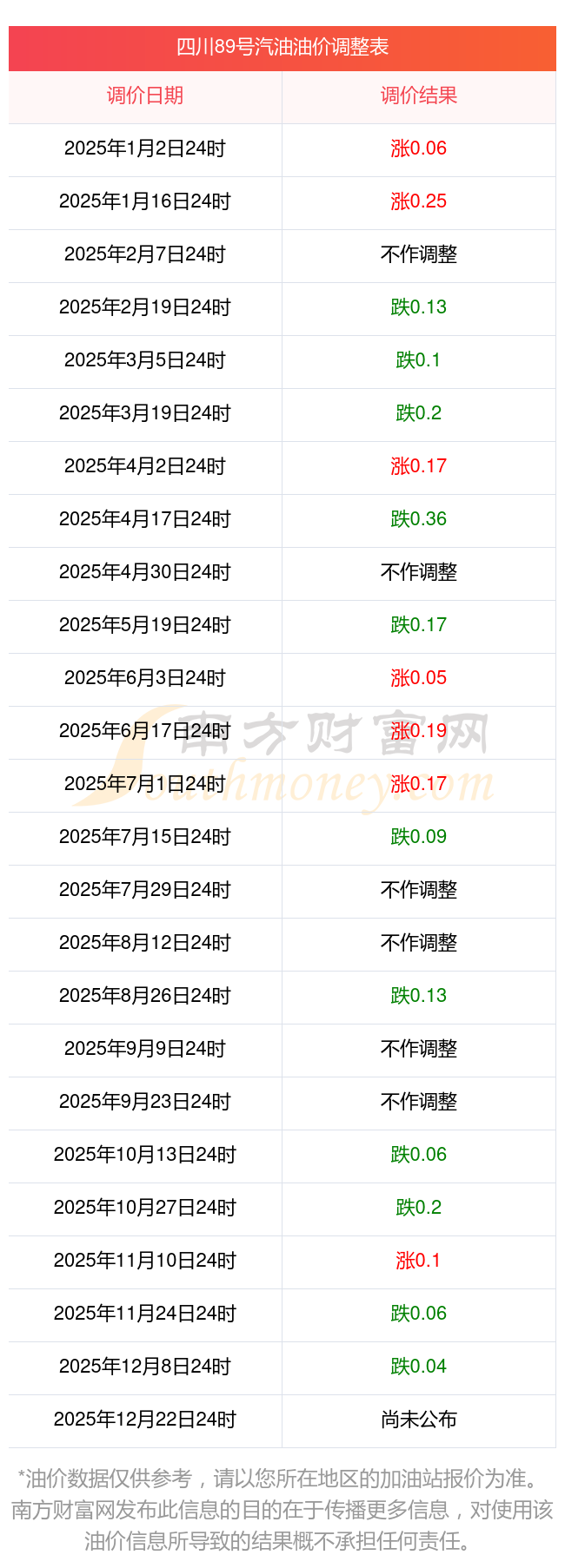 以上数据仅供参考,请以您所在地区的加油站实际售价为准。南方财富网发布此信息的目的在于传播更多信息,对使用该油价信息所导致的结果概不承担责任。