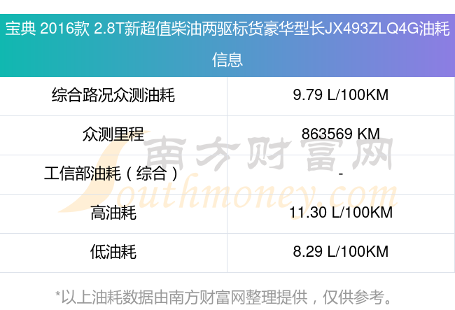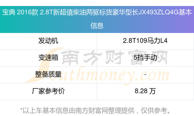 宝典 2016款 2.8T新超值柴油两驱标货豪华型长JX493ZLQ4G动力上配备的是一台2.8T109马力L4涡轮增压发动机,匹配的是5挡手动挡变速箱,燃料形式为柴油,厂家参考价8.28万元。