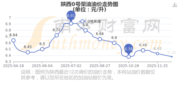 12月16日,陕西0号柴油的价格是6.38元每升,本次的调整时间为12月9日,对比上次的调整降了0.05元,降0.778%,12月22日24时为下一轮油价调整时间,还有6.89天。