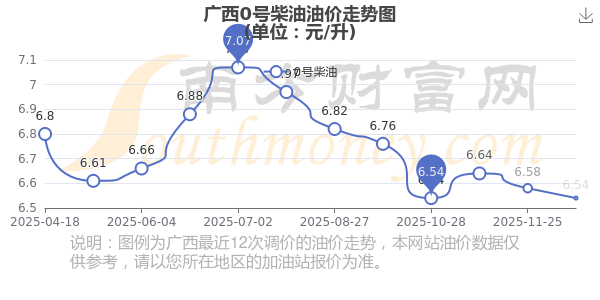 汽油价格调整最新消息:下一轮油价调整时间12月22日24时。12月16日广西汽油、柴油的价格多少钱一升?本轮油价调整时间是12月9日,92号汽油6.9元,下降了0.05元,下降幅达0.72%;95号汽油7.46元,下降了0.05元,下降幅达0.67%;89号汽油6.43元,下降了0.04元,下降幅达0.62%;0号柴油6.54元,下降了0.04元,下降幅达0.61%。