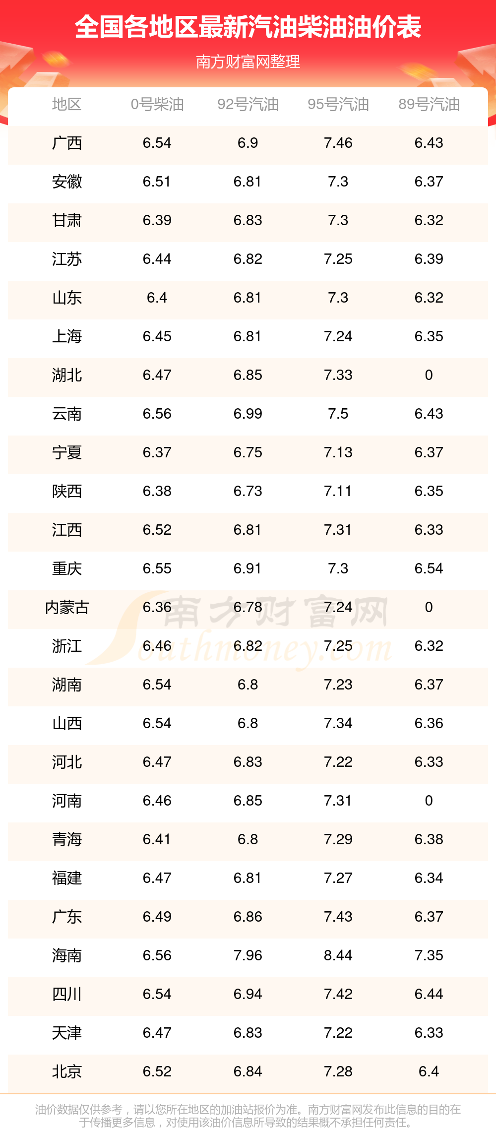 以上油价信息是当前市场上最新油价信息,油价数据仅供参考,实际在售油价可能有小幅偏差,请以您所在地区的加油站实际售价为准。