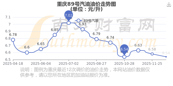 12月16日,重庆89号汽油的价格是6.54元每升,本次的调整时间为12月9日,对比上次的调整下跌了0.04元,下跌0.608%,下次调整时间为12月22日24时,还有6.84天。