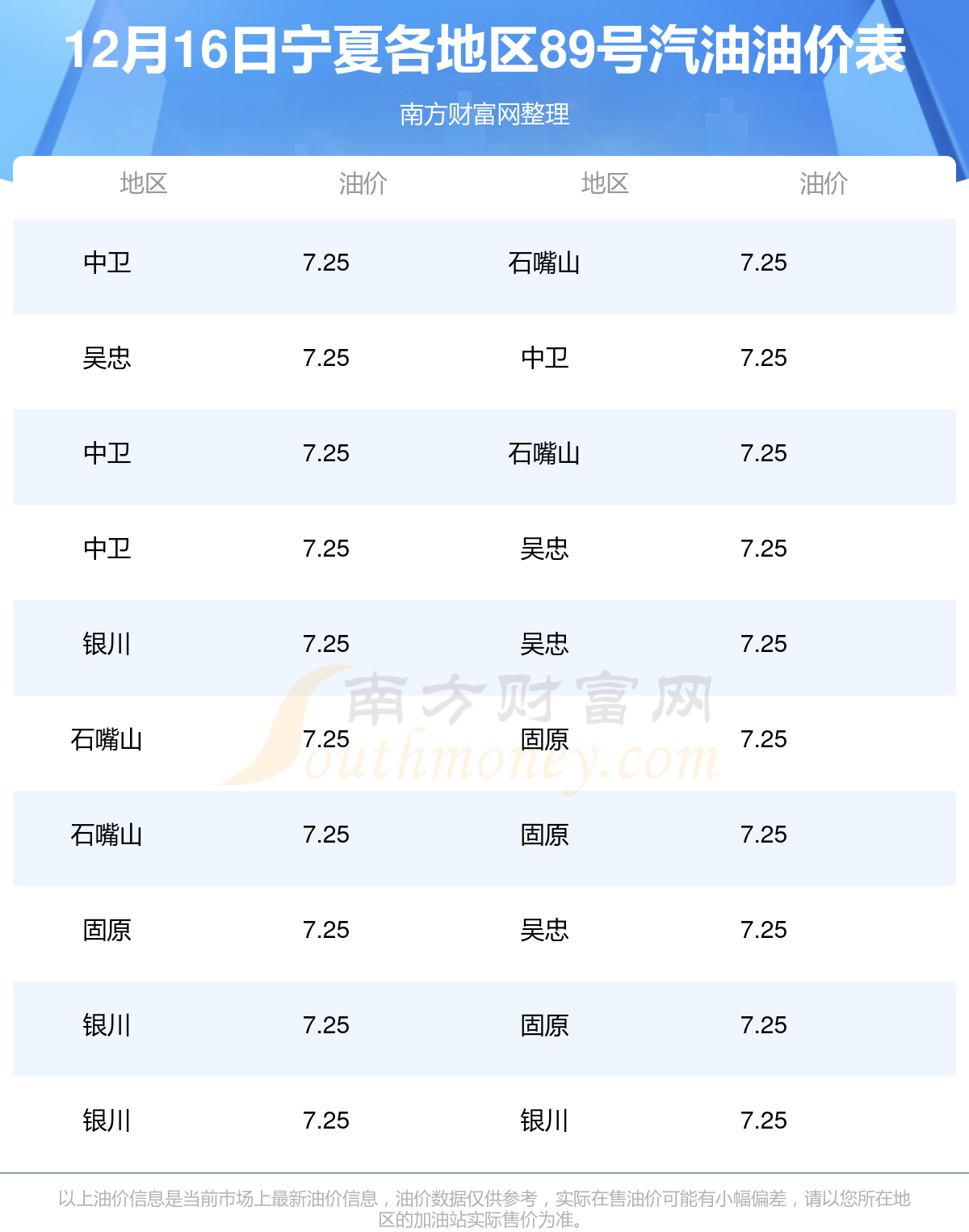 2025年12月16日宁夏89号汽油最新价格一览表
