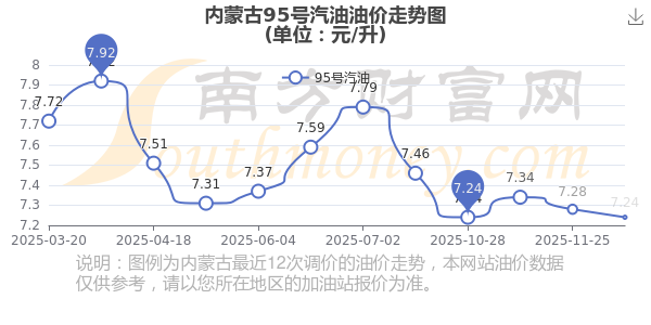 12月16日,内蒙古95号汽油的价格是7.24元每升,本次的调整时间为12月9日,对比上次的调整减了0.04元,减0.549%,12月22日24时为下一轮油价调整时间,还有6.82天。