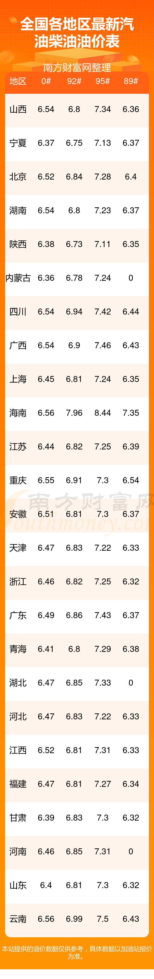 油价数据仅供参考,请以您所在地区的加油站报价为准。南方财富网发布此信息的目的在于传播更多信息,对使用该油价信息所导致的结果概不承担任何责任。