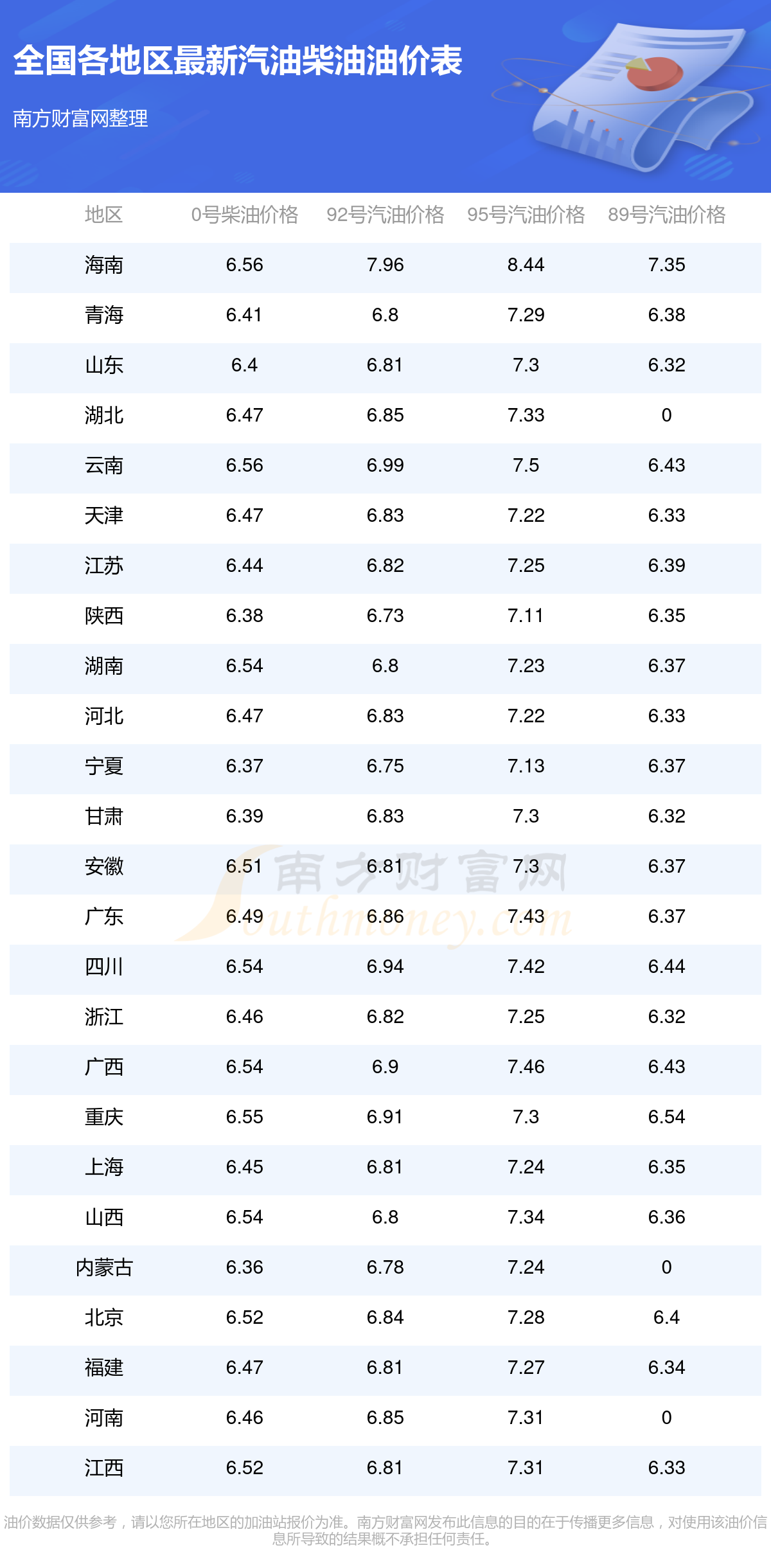 以上油价信息是当前市场上最新油价信息,油价数据仅供参考,实际在售油价可能有小幅偏差,请以您所在地区的加油站实际售价为准。