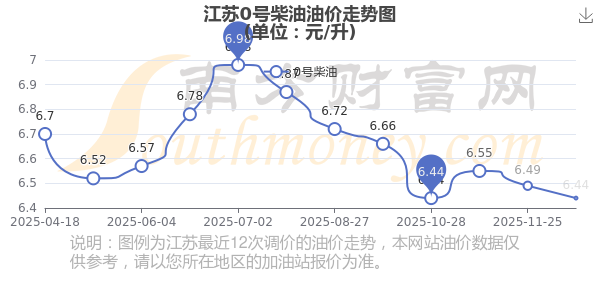 12月16日,江苏0号柴油的价格是6.44元每升,本次的调整时间为12月9日,对比上次的调整降了0.05元,降0.77%,12月22日24时为下一轮油价调整时间,还有6.79天。