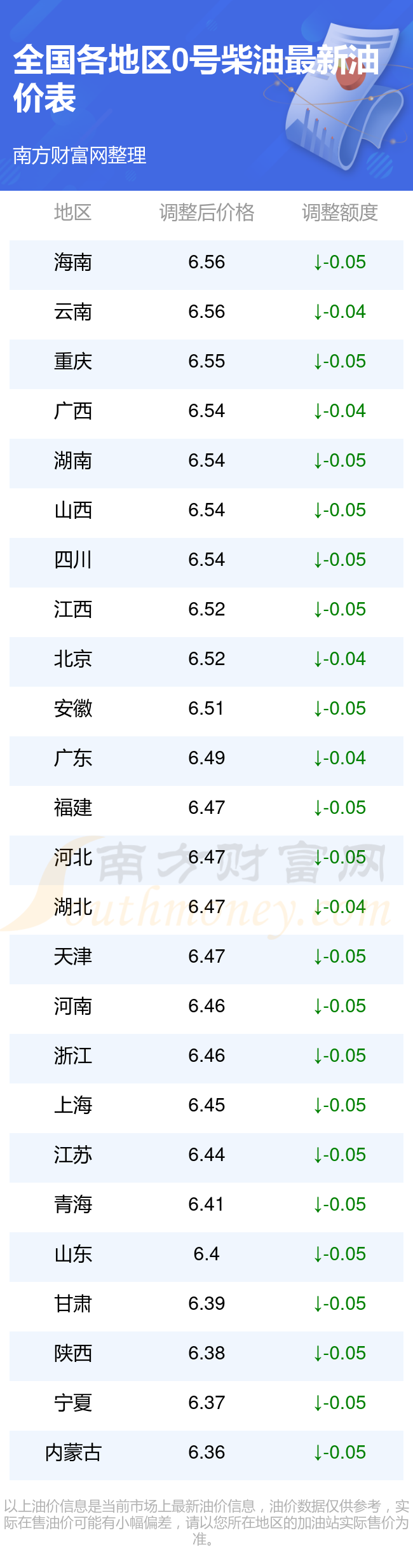 全国各地区0号柴油油价一览表