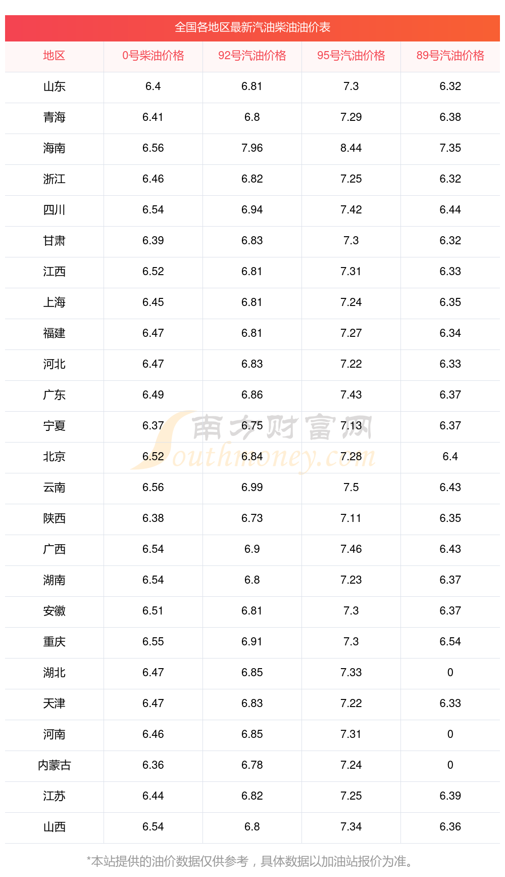 以上油价信息是当前市场上最新油价信息,油价数据仅供参考,实际在售油价可能有小幅偏差,请以您所在地区的加油站实际售价为准。