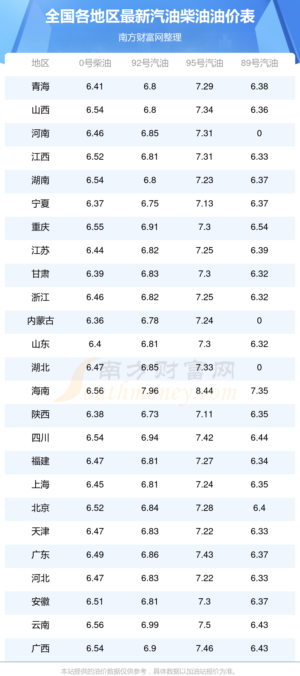 油价数据仅供参考,请以您所在地区的加油站报价为准。南方财富网发布此信息的目的在于传播更多信息,对使用该油价信息所导致的结果概不承担任何责任。