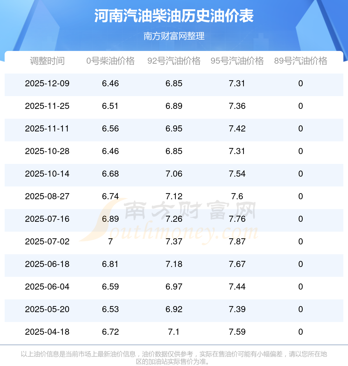 2025年12月16日河南92号汽油价格一览表,92号95号汽油多少钱一升今日油价