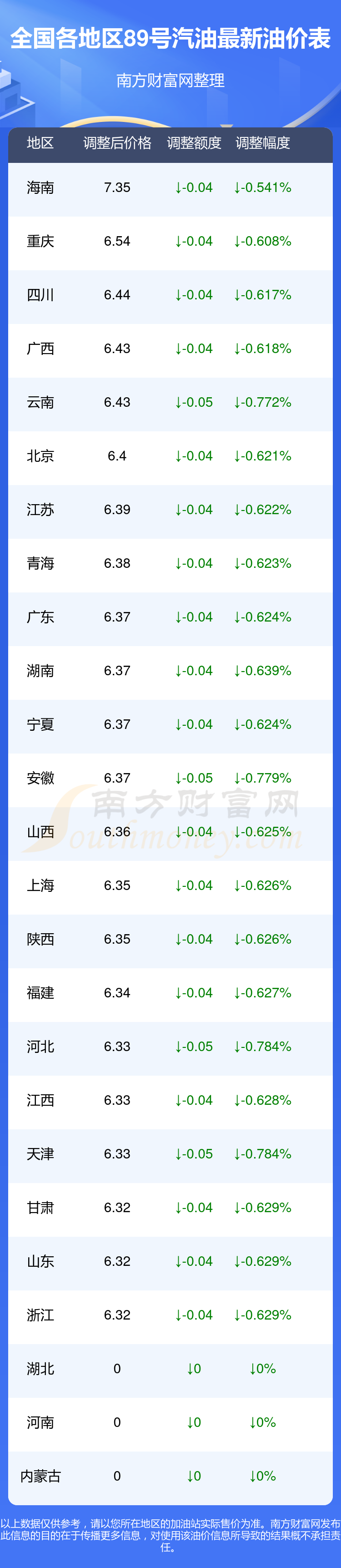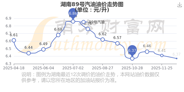 12月16日,湖南89号汽油的价格是6.37元每升,本次的调整时间为12月9日,对比上次的调整下调了0.04元,下调0.639%,12月22日24时为下一轮油价调整时间,还有6.76天。