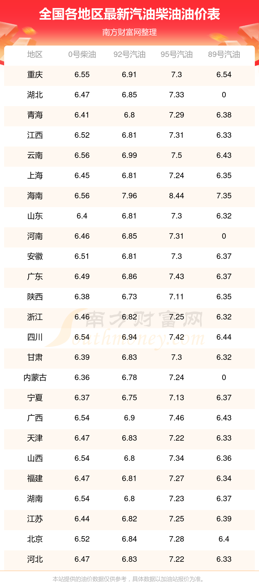 全国0号柴油最新平均价格为:6元每升,其中,最高为海南,价格为6.56元/升,最低为内蒙古,价格为6.36元/升。