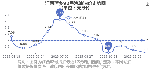 江西萍乡汽油、柴油12月16日的价格是多少钱一升?详情为:92号汽油为6.81元,减了0.04元;95号汽油为7.31元,减了0.04元;89号汽油为6.33元,减了0.04元;0号柴油为6.52元,减了0.05元,本次油价的调整时间为12月9日。下一轮油价调整时间12月22日24时,距离现在还有6.74天。