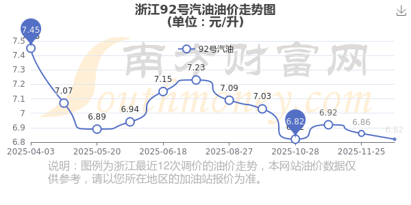 12月16日,浙江92号汽油的价格是6.82元每升,本次的调整时间为12月9日,对比上次的调整跌了0.04元,跌0.583%,下次调整时间为12月22日24时,还有6.73天。