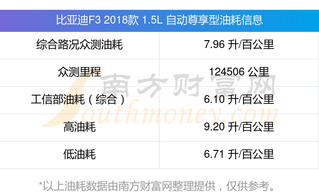 根据多位车主实测得出数据,该车型低油耗为6.71升每百公里,高油耗为9.20升每百公里,综合路况众测油耗为7.96升每百公里,工信部综合油耗为6.10升每百公里。