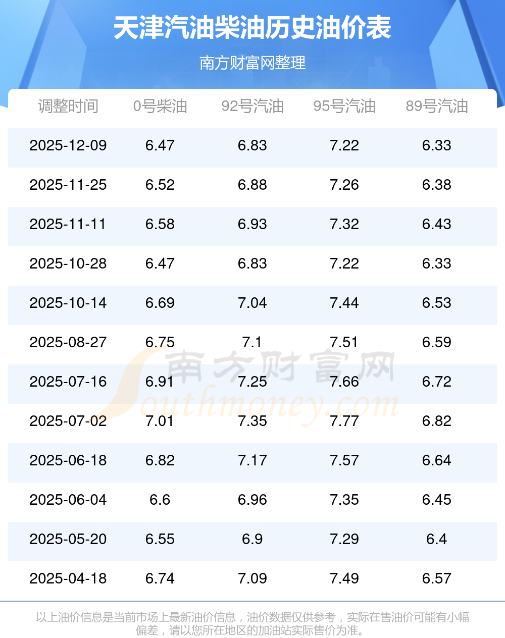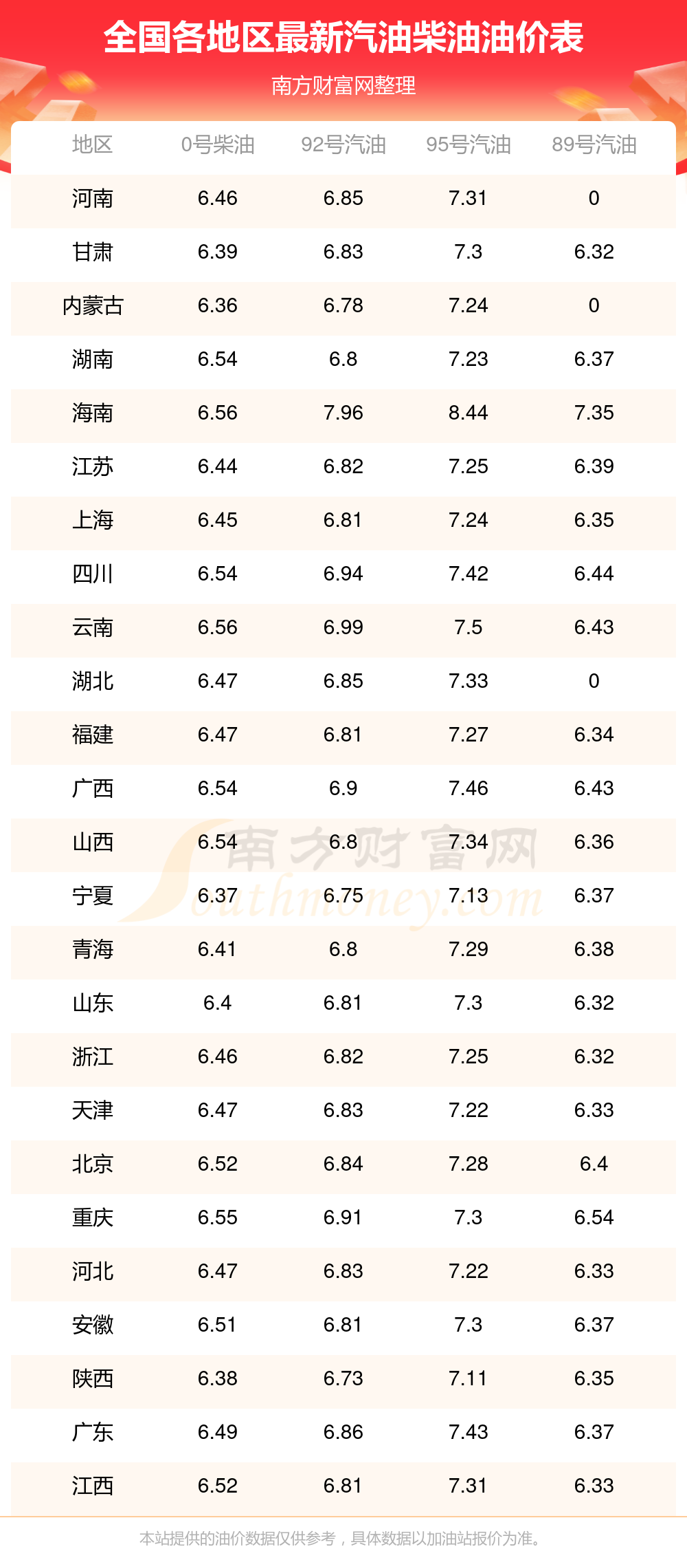 (12月16日)全国油价一览表
