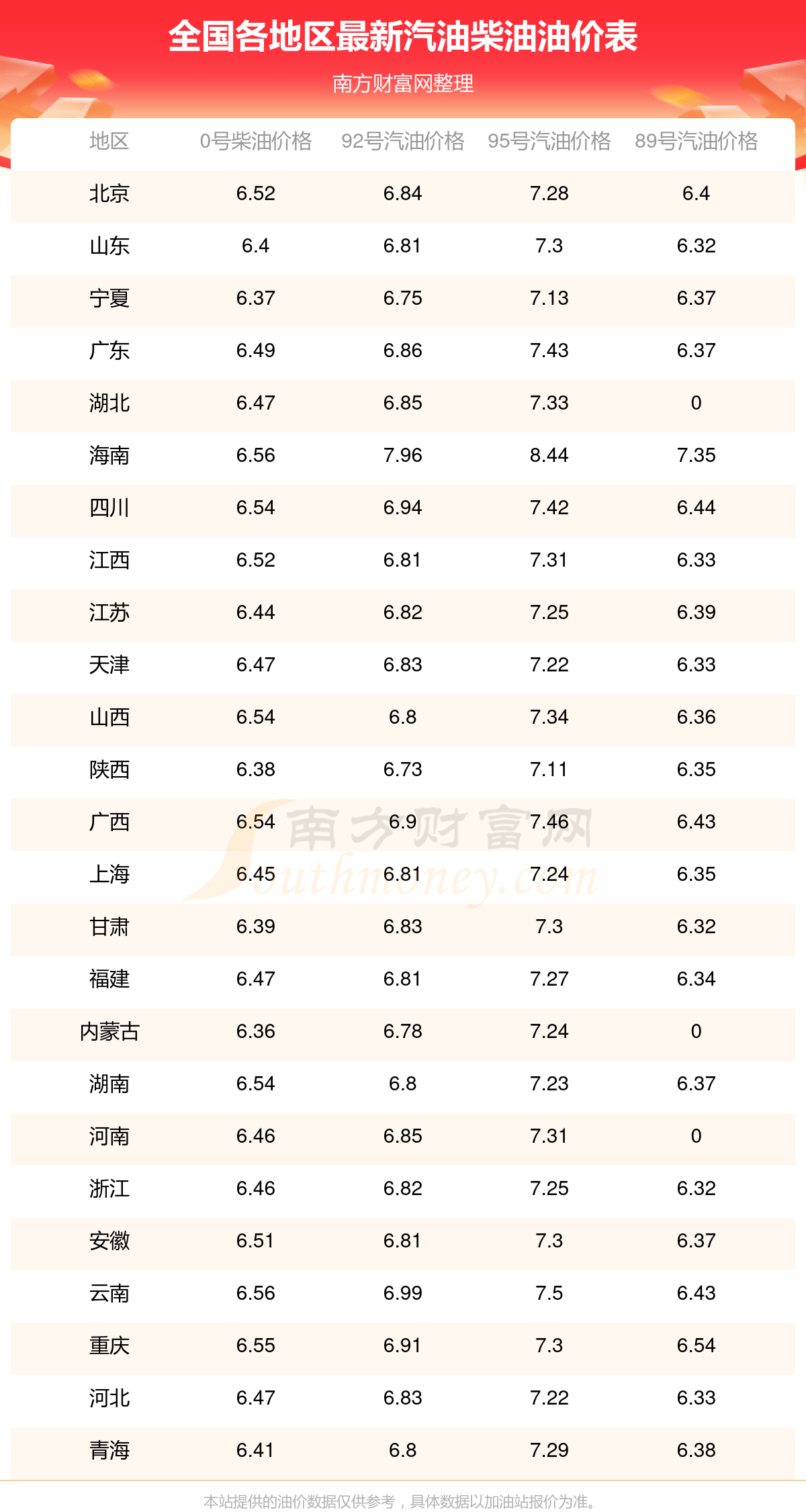 2025年12月16日全国油价调整及最新汽油价格表